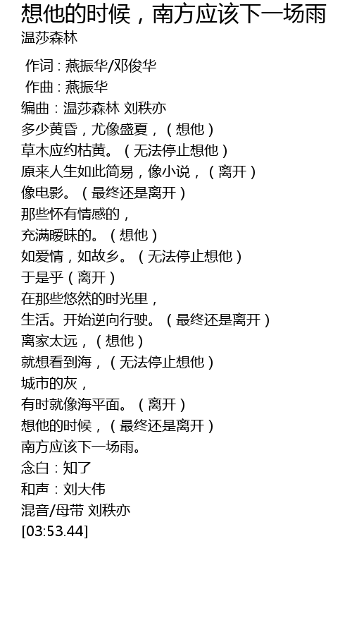 | [03:44.75] | 想他的时候,(最终还是离开) |