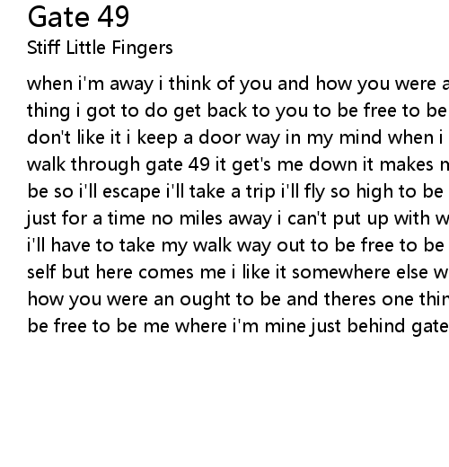 when i'm away i think of you and how you were an ought to be and theres one thing i got to do get back to you to be free to be me (chorus:) cause any time i don't like it i keep a door way in my mind when i want to be with you i just walk through gate 49 it get's me down it makes me sick to be somewhere i hate to be so i'll escape i'll take a trip i'll fly so high to be free to be me (chorus) just for a time no miles away i can't put up with what must be and prety soon i'll have to take my walk way out to be free to be me i may be tired of life it self but here comes me i like it somewhere else when i'm away i thnk of you and how you were an ought to be and theres one thing i got to do get back to you to be free to be me where i'm mine just behind gate 49 |