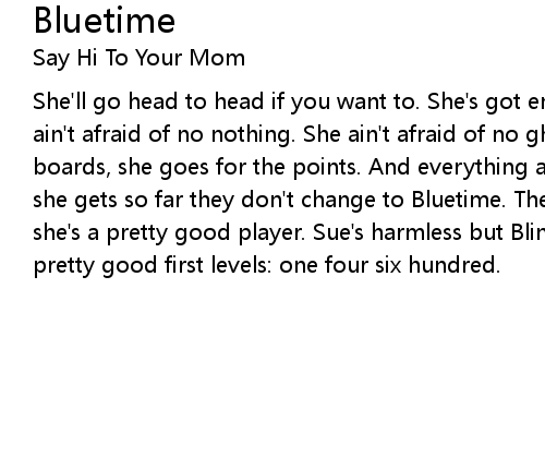 | She'll go head to head if you want to. She's got endorsements from Namco. She ain't afraid of no nothing. She ain't afraid of no ghosts. You go for the boards, she goes for the points. And everything aches on you in the morning. And she gets so far they don't change to Bluetime. They just turn around. Yeah, ok, she's a pretty good player. Sue's harmless but Blinky's the sneak. She's got pretty good first levels: one four six hundred. |