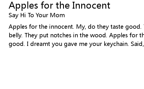 | Apples for the innocent. My, do they taste good. They put fire back in your belly. They put notches in the wood. Apples for the innocent. My, do they taste good. I dreamt you gave me your keychain. Said, "Pick one, ok?" |