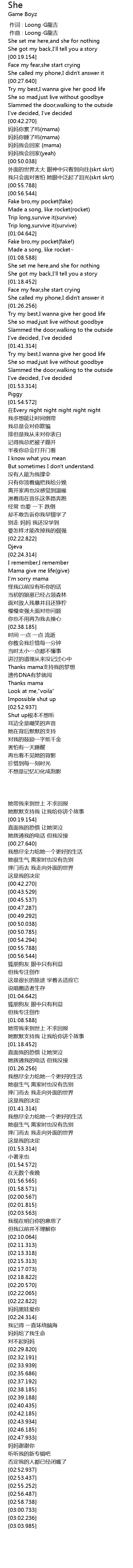 | [00:54.294] | 我只会面对害怕 她眼中泛起了泪光(skrt skrt) |