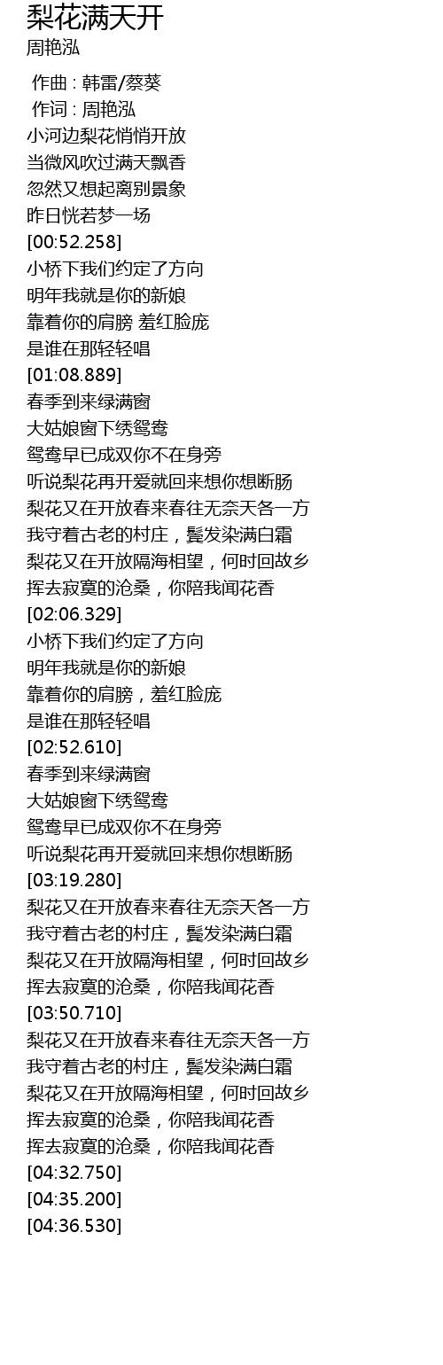 | [03:52.600] | 梨花又在开放春来春往无奈天各一方 |