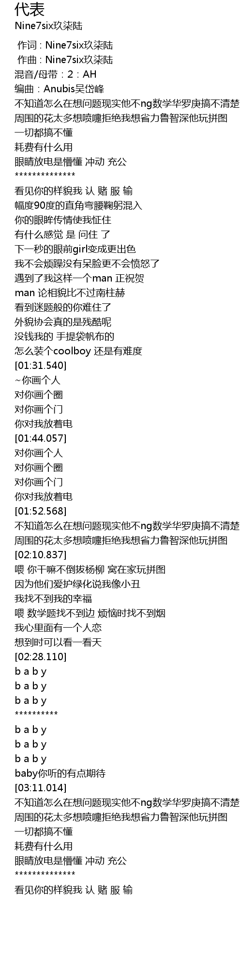 | [00:00.000] | 作词 : Nine7six玖柒陆 |