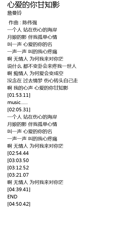 | [03:57.85][03:03.50] | 啊 痴情人 为何爱会变成空 |