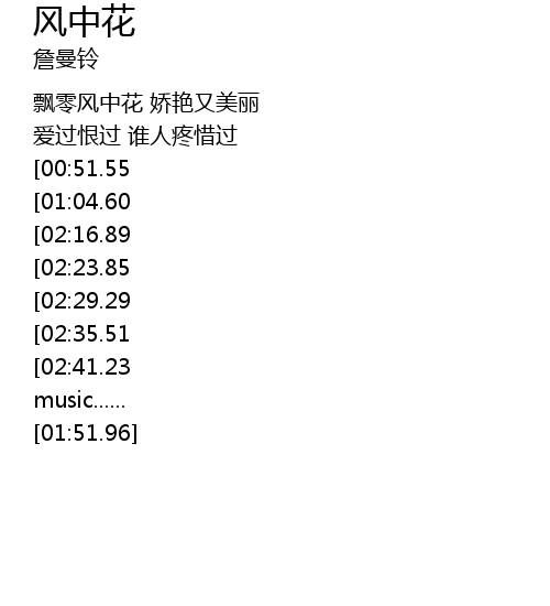 | [02:41.65][02:16.89][01:15.32] | 风中花 落土随风吹 |
