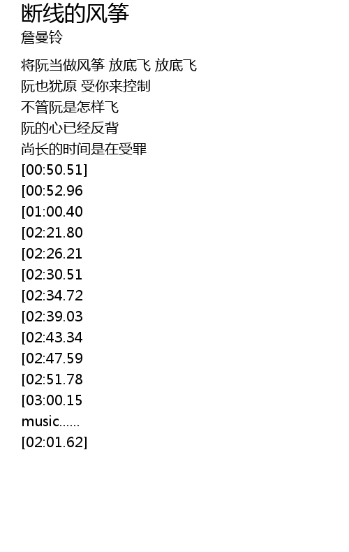 | [03:00.56][02:21.80][01:09.03] | 希望阮是断线的风筝 |