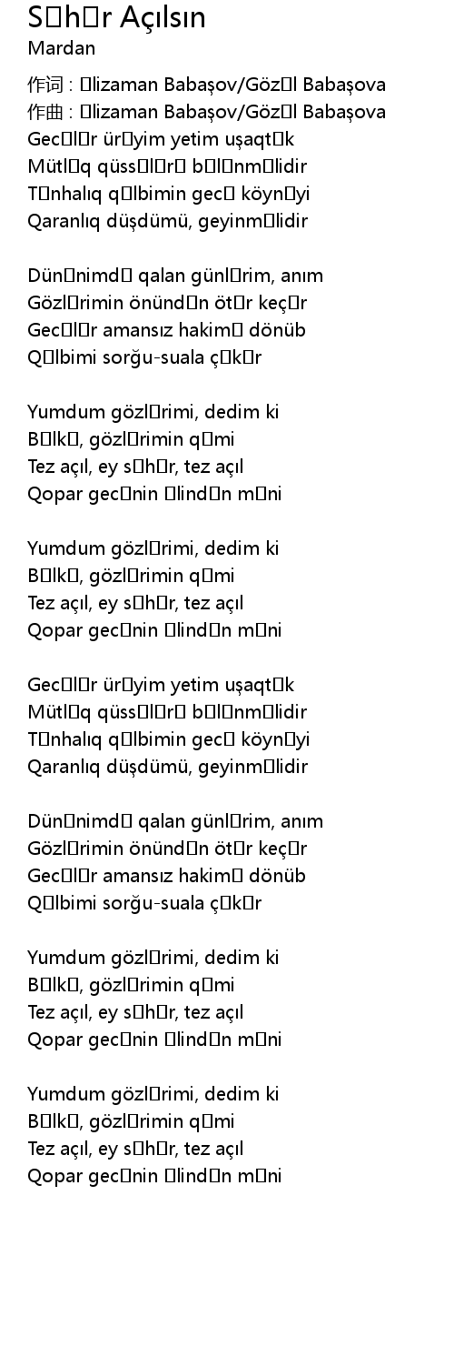 | 作词 : Əlizaman Babaşov/Gözəl Babaşova | |