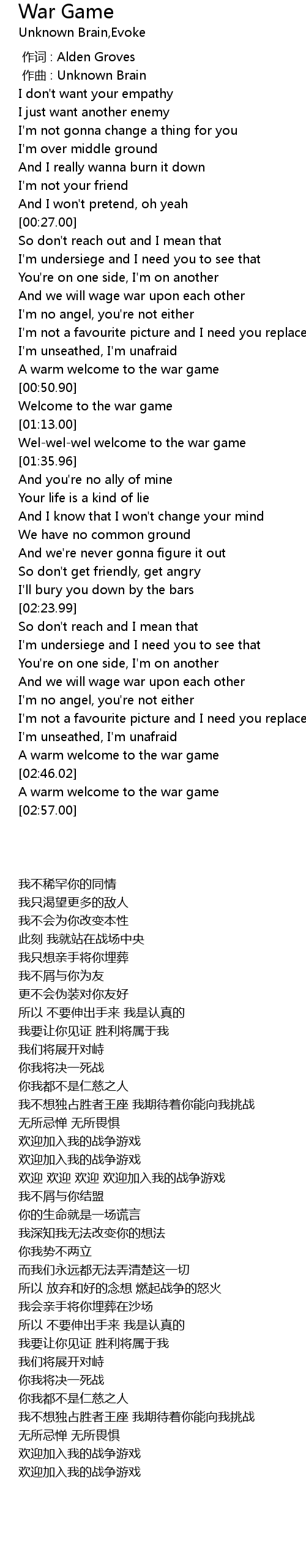| [01:11.98] | Welcome to the war game |