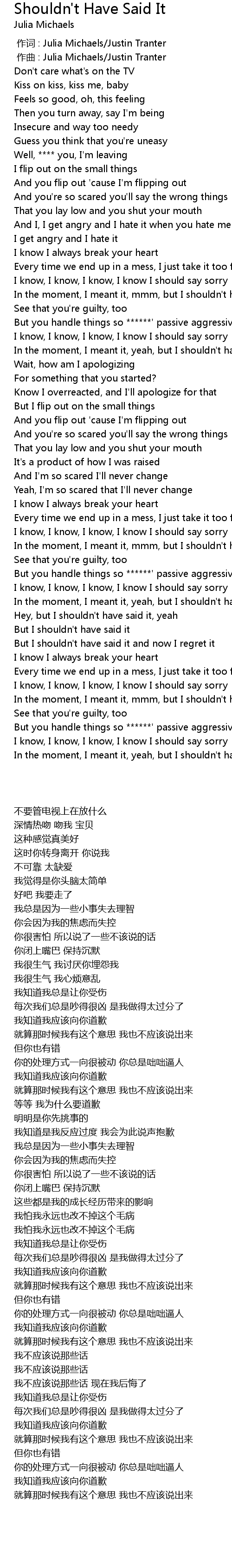 | [01:14.46] | In the moment, I meant it, mmm, but I shouldn' t have said it |