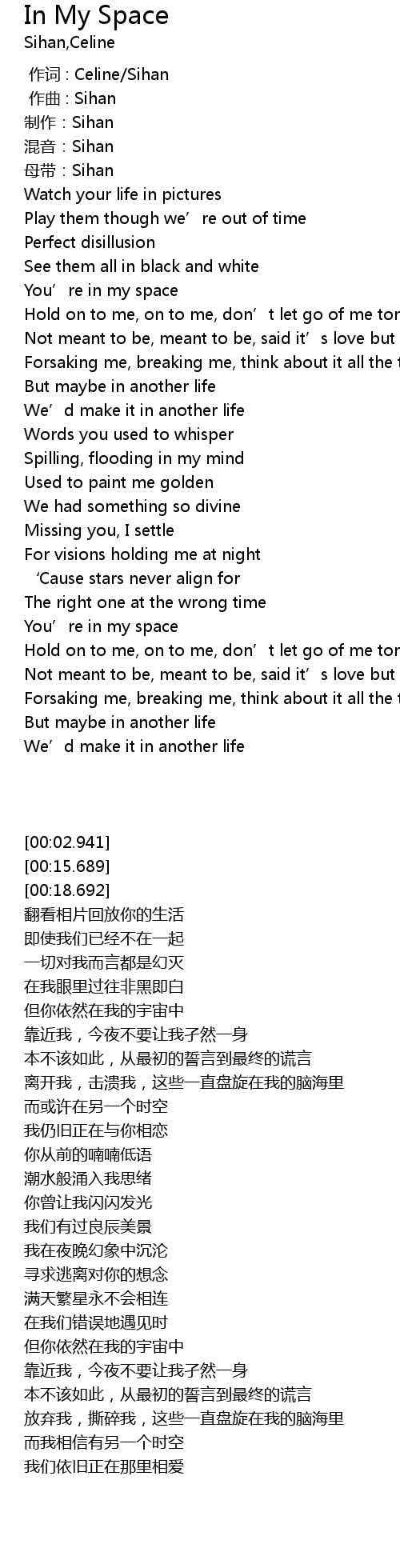 | [00:00.000] | 作词 : Celine/Sihan |