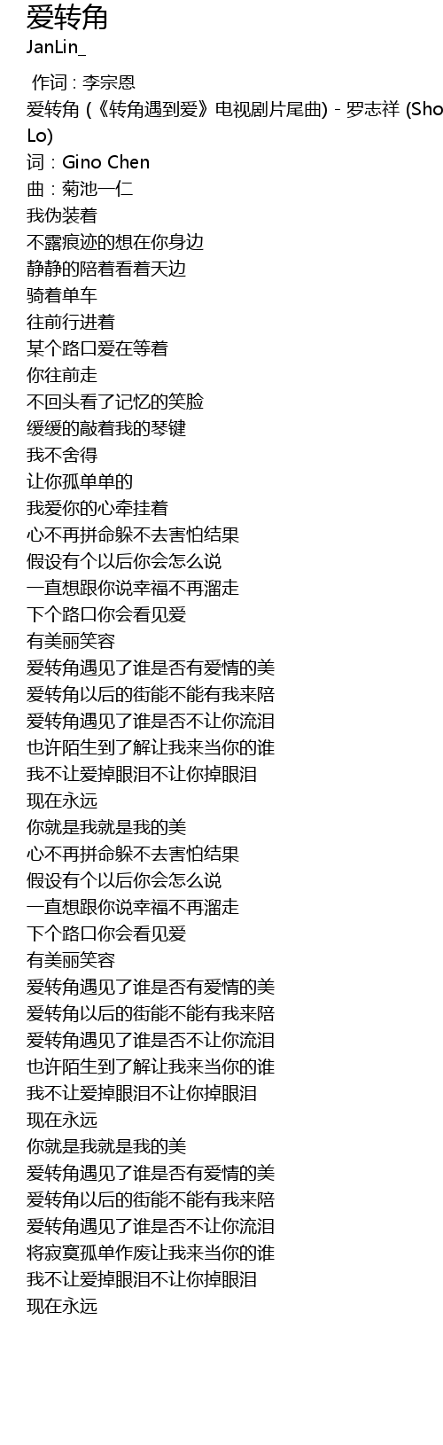 | [00:10.463] | 爱转角 (《转角遇到爱》电视剧片尾曲) - 罗志祥 (Show Lo) |
