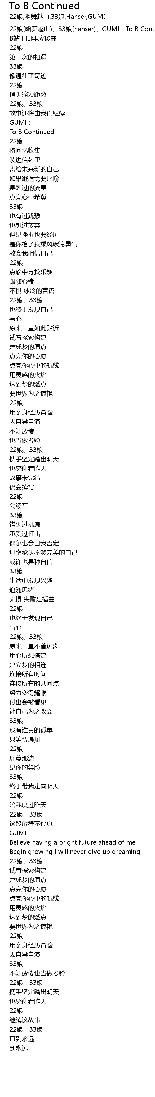| [00:00.00] | 22娘(幽舞越山)、33娘(hanser)、GUMI - To B Continued |