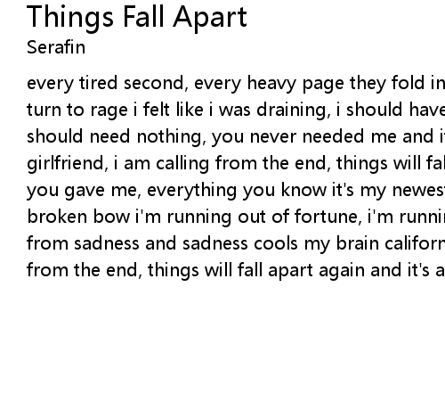 every tired second, every heavy page they fold into a nightmare, they almost turn to rage i felt like i was draining, i should have been happy an no one should need nothing, you never needed me and its always raining californian girlfriend, i am calling from the end, things will fall apart again everything you gave me, everything you know it's my newest form of torture, my newest broken bow i'm running out of fortune, i'm running out of pain and i benefit from sadness and sadness cools my brain californian girlfriend, i am calling from the end, things will fall apart again and it's always raining |