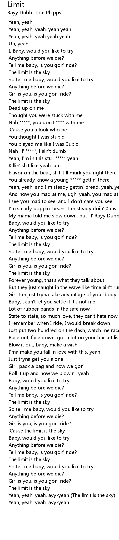 | [03:00.659] | Yeah, yeah, yeah, ayy-yeah (The limit is the sky) |
