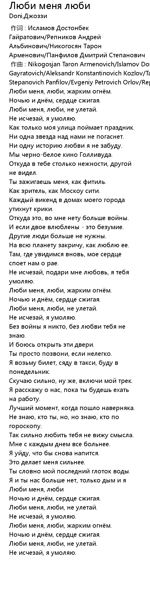 作词 : Исламов Достонбек Гайратович/Репников Андрей Альбинович/Никогосян Тарон Арменович/Панфилов Дмитрий Степанович |