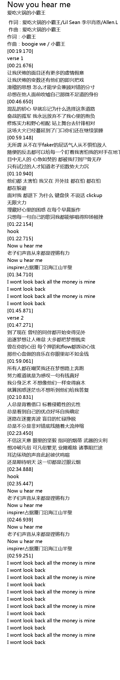 | [00:00.000] | 作词 : 爱吃火锅的小霸王/Lil Sean 李尔肖恩/Allen.L |