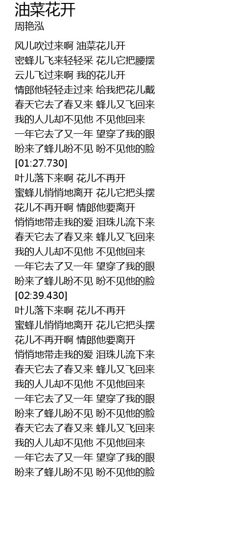 | [00:28.450] | 风儿吹过来啊 油菜花儿开 |