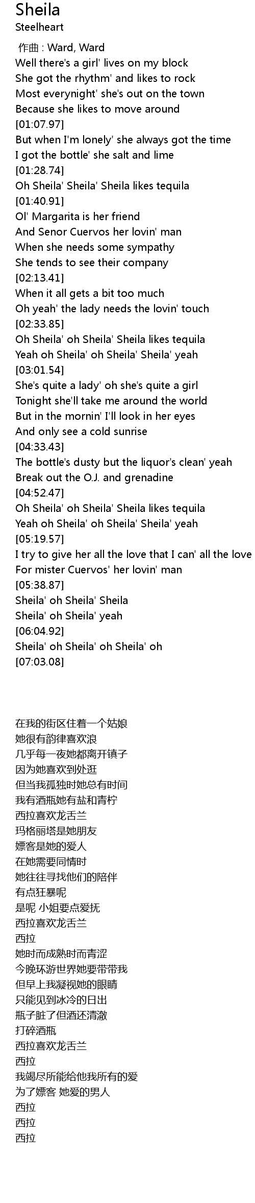 | [04:52.75] | Oh Sheila' oh Sheila' Sheila likes tequila |