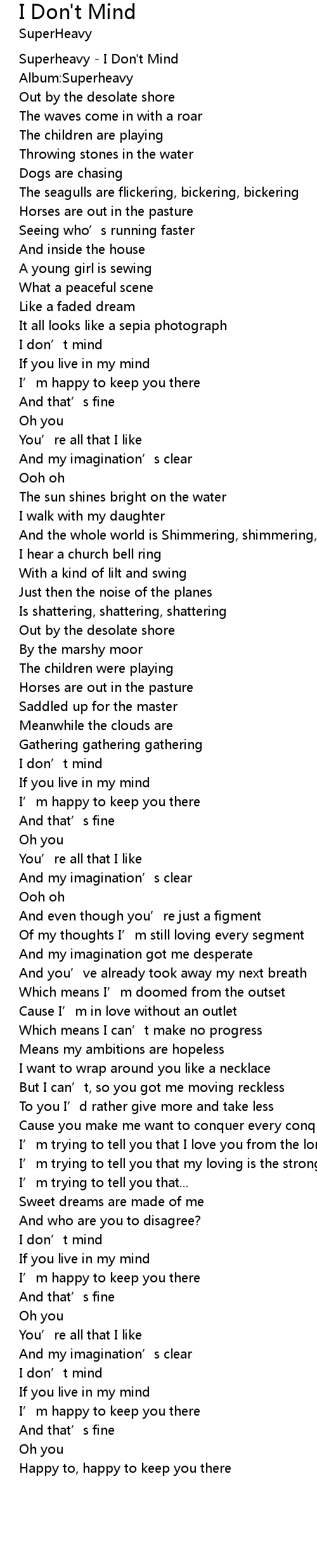 | [00:01.08] | Superheavy - I Don't Mind |