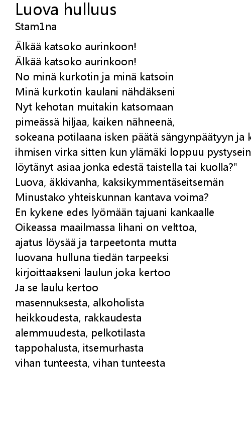 | sokeana potilaana isken p t s ngynp tyyn ja kyselen ett " mik on ihmisen virka sitten kun yl m ki loppuu pystysein n ja toteaa ettei l yt nyt asiaa jonka edest taistella tai kuolla?" | |