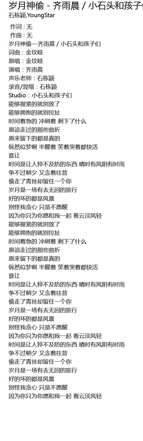 | [00:05.967] | 岁月神偷—齐雨晨/小石头和孩子们 |