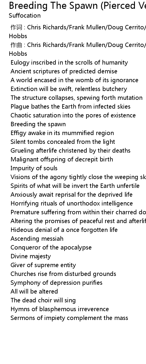| [00:01.000] | zuo qu : Chris Richards Frank Mullen Doug Cerrito Doug Bohn Terrance Hobbs |