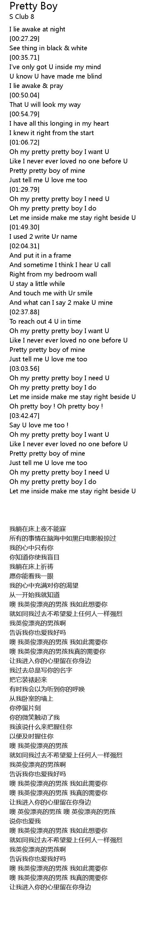 | [02:43.60] | Oh my pretty pretty boy I want U |