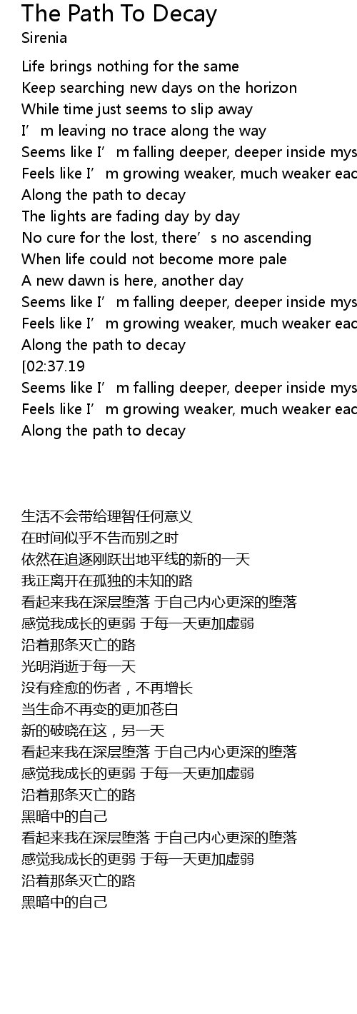 | [02:15.24] | Feels like I' m growing weaker, much weaker each day |