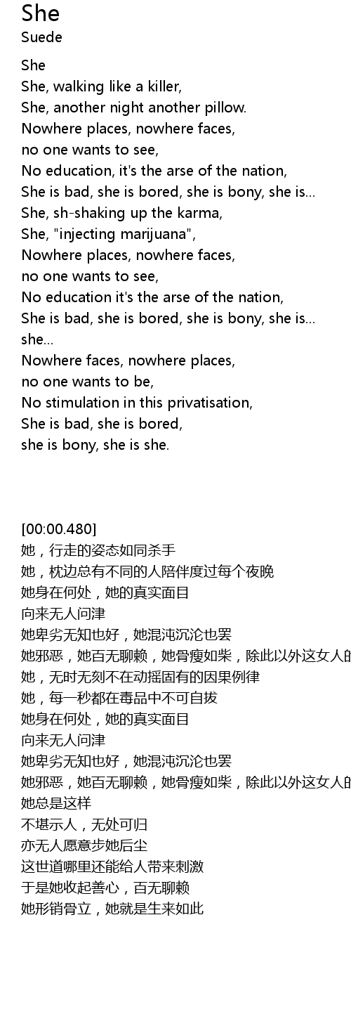 | [01:35.190] | She is bad, she is bored, she is bony, she is... |