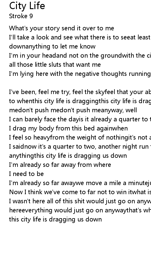 I've been, feel me try, feel the skyfeel that your ableto do what it is you need to whenthis city life is draggingthis city life is dragging us downdon't push medon't push medon't push meanyway, well |