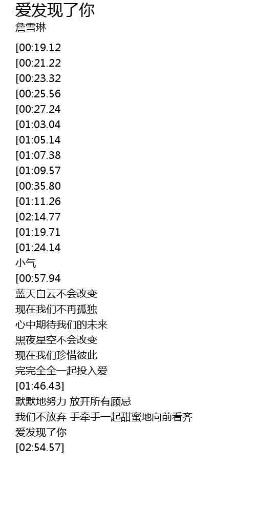 | [02:10.68][01:11.26][00:35.81] | 爱发现了你 多么不可思议 |