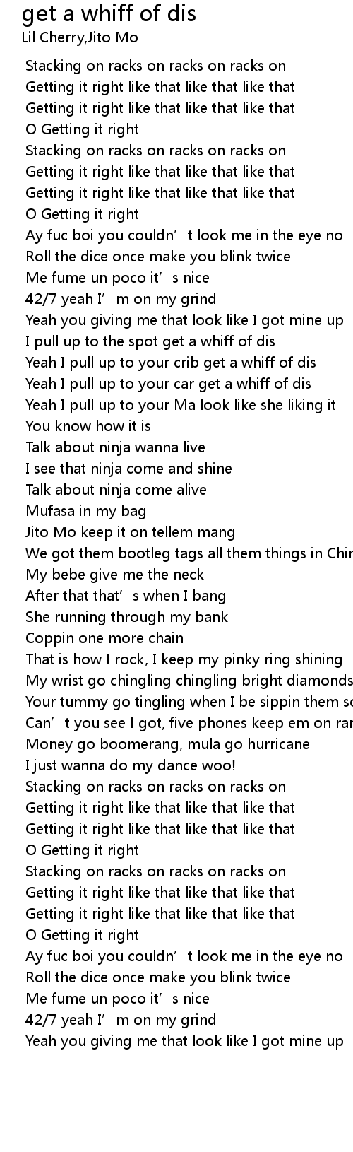 | [00:41.886] | I pull up to the spot get a whiff of dis |