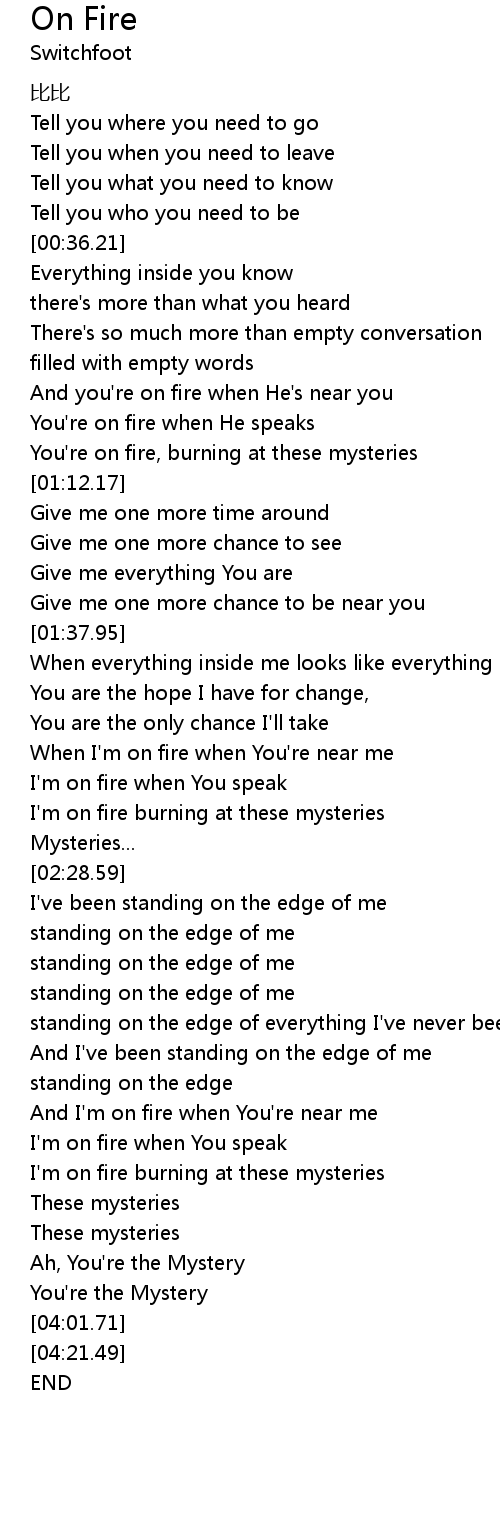 | [01:00.75] | You're on fire, burning at these mysteries |