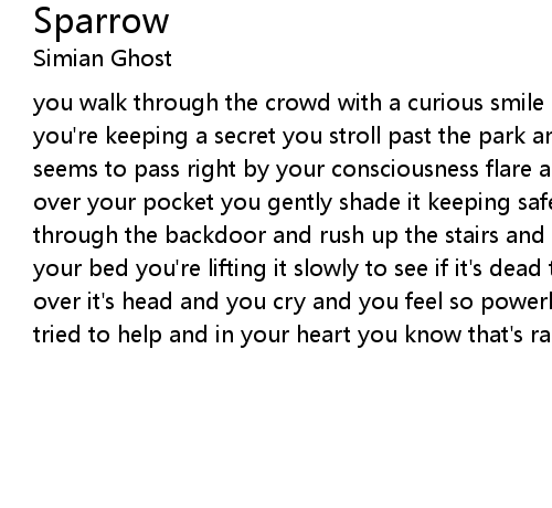you walk through the crowd with a curious smile on your face you look like you're keeping a secret you stroll past the park and the houses and cars it all seems to pass right by your consciousness flare and you rush home with your hand over your pocket you gently shade it keeping safe what it contains you slide through the backdoor and rush up the stairs and you sit on the floor next to your bed you're lifting it slowly to see if it's dead the wings rest in silence over it's head and you cry and you feel so powerless but at least you tried you tried to help and in your heart you know that's rare these days |