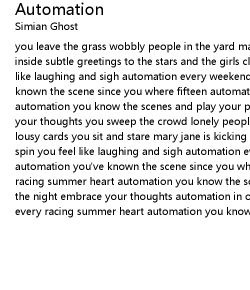 you leave the grass wobbly people in the yard making faces at the cars you go inside subtle greetings to the stars and the girls climbing their arms you feel like laughing and sigh automation every weekend you restart automation you've known the scene since you where fifteen automation every racing summer heart automation you know the scenes and play your part come - let the night embrace your thoughts you sweep the crowd lonely people trying hard to conceal their lousy cards you sit and stare mary jane is kicking in and the room begins to spin you feel like laughing and sigh automation every weekend you restart automation you've known the scene since you where fifteen automation every racing summer heart automation you know the scenes and play your part come - let the night embrace your thoughts automation in our daydream nation automation every racing summer heart automation you know the scenes and play your part |