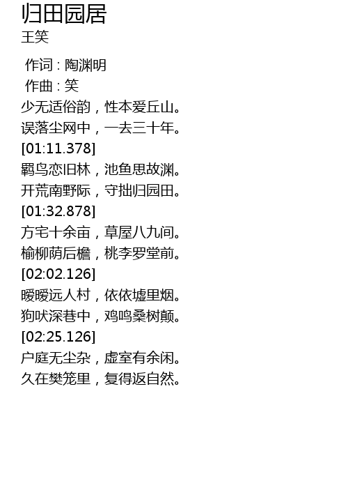 | [01:23.629] | 开荒南野际,守拙归园田。 |
