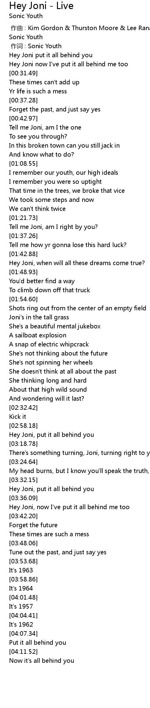 | [00:22.31] | Hey Joni put it all behind you |