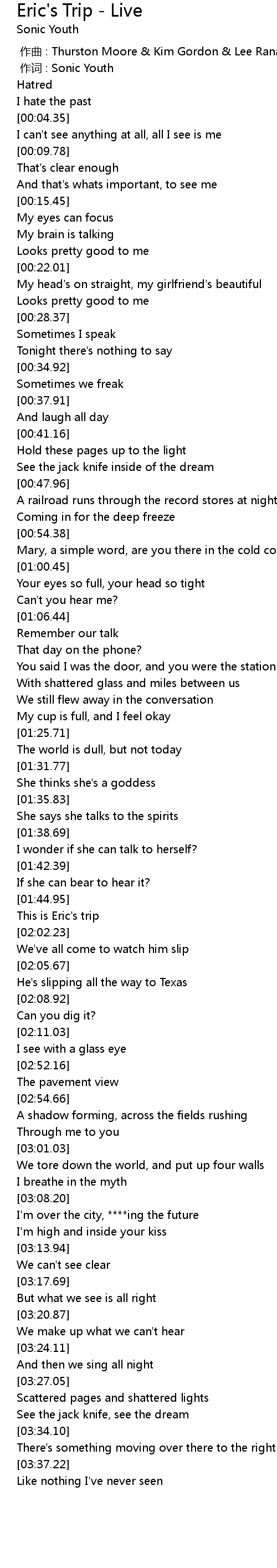 | [00:00.00] | 作曲 : Thurston Moore & Kim Gordon & Lee Ranaldo & Steve Shelley |