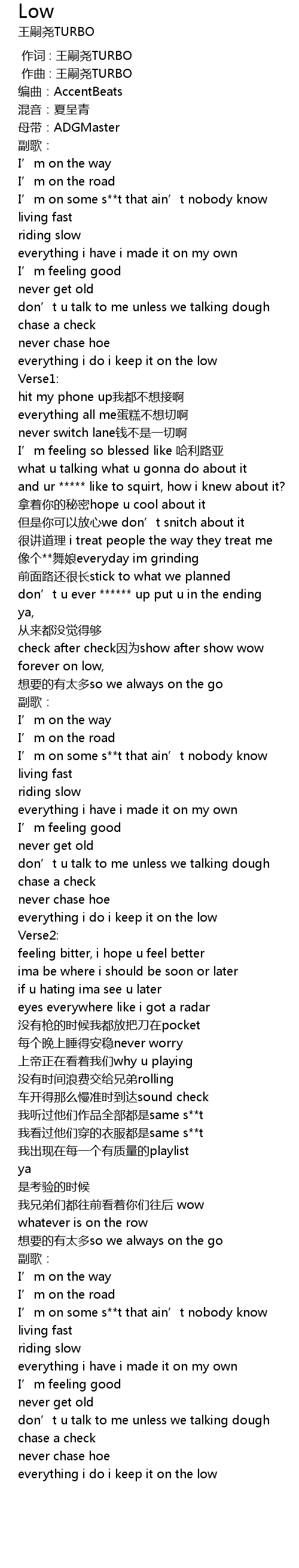 | [00:13.628] | I' m on some s t that ain' t nobody know |