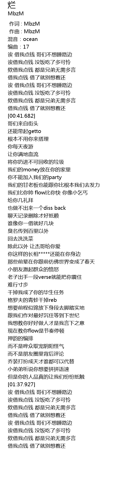 | [01:39.431] | 诶 借我点钱 哥们不想睡路边 |