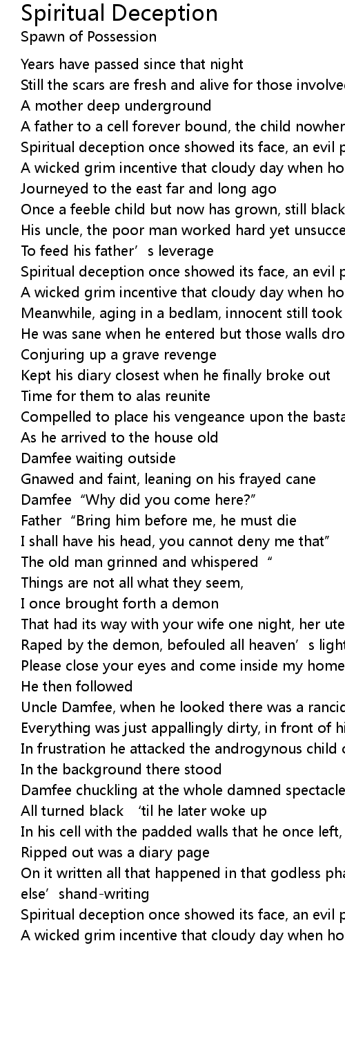 | Spiritual deception once showed its face, an evil passed on through its blood | |
