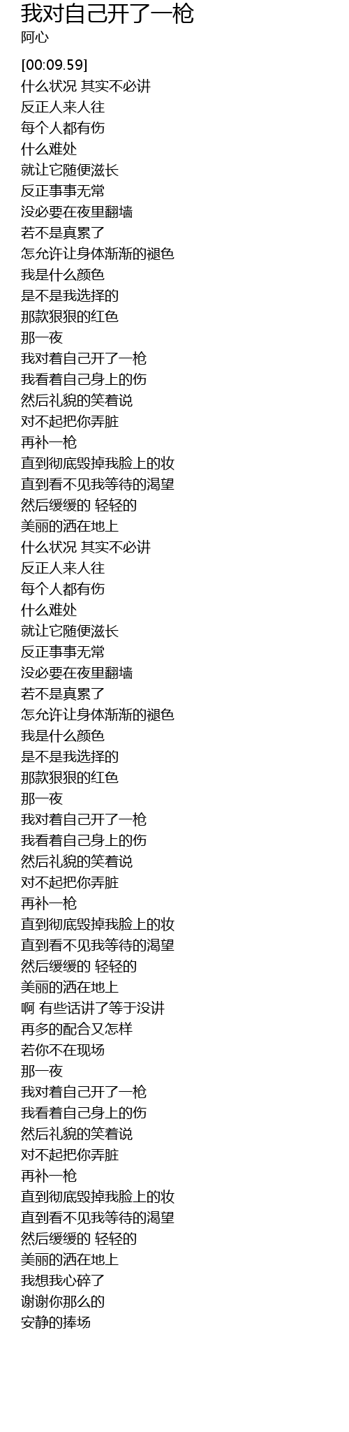 | [01:15.75] | wǒ duì zhe zì jǐ kāi le yī qiāng |