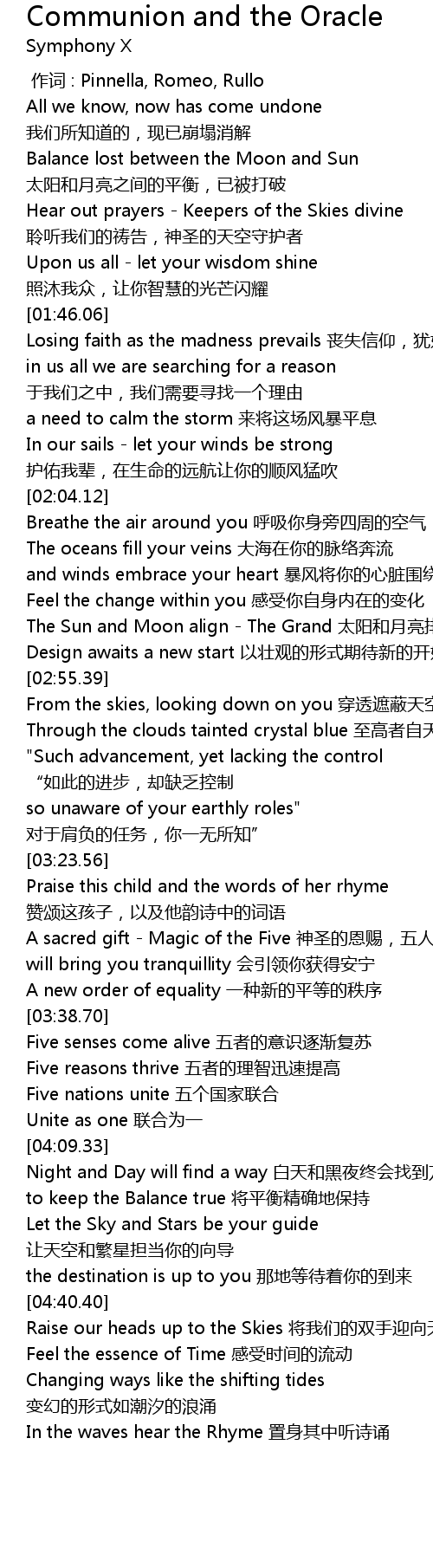 | [01:38.56] | Hear out prayers Keepers of the Skies divine ling ting wo men de dao gao, shen sheng de tian kong shou hu zhe |