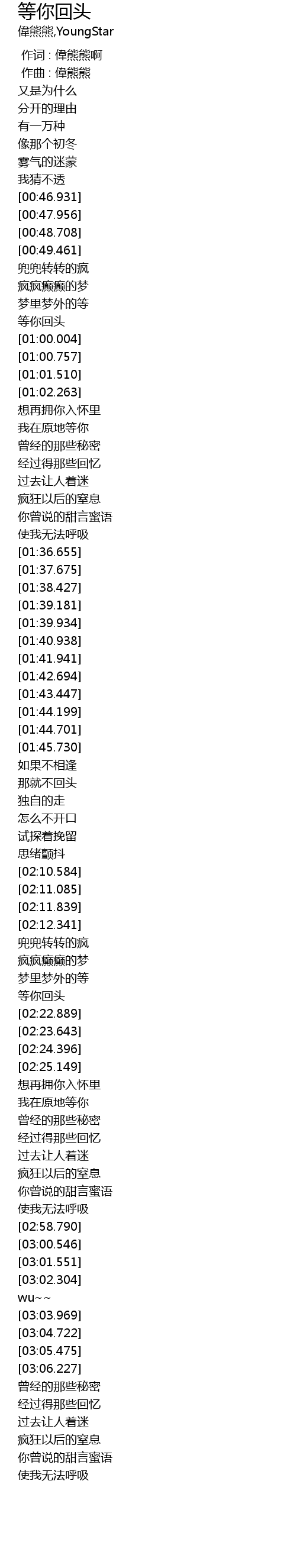 | [02:31.678] | wǒ zài yuán dì děng nǐ |