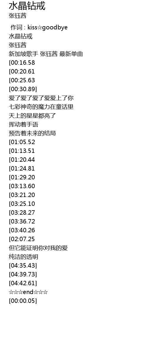 | [03:59.21][03:28.27][01:51.58] | 我的钻戒水晶它晶莹透明 |
