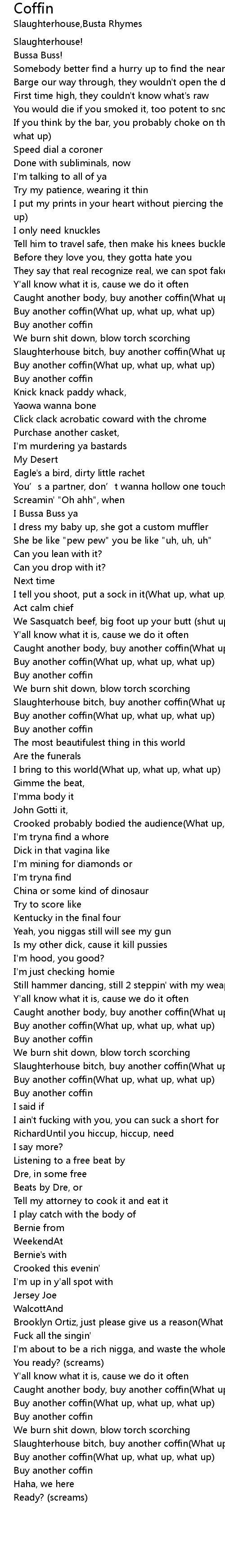 | Slaughterhouse bitch, buy another coffin(What up, what up, what up) | |