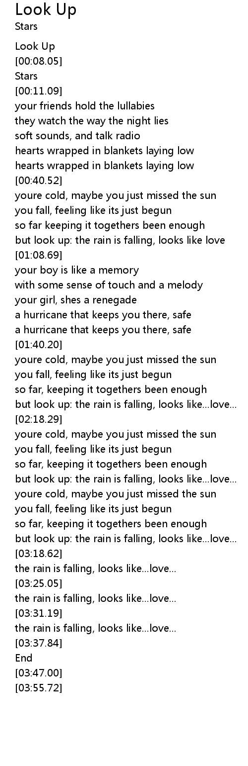 | [01:00.53] | but look up: the rain is falling, looks like love |
