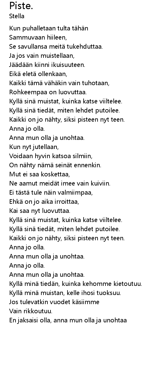 | Kaikki on jo n hty, siksi pisteen nyt teen. | |
