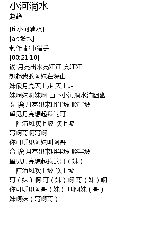 | [01:05.600] | mei a mei a mei a shan xia xiao he tang shui qing you you |