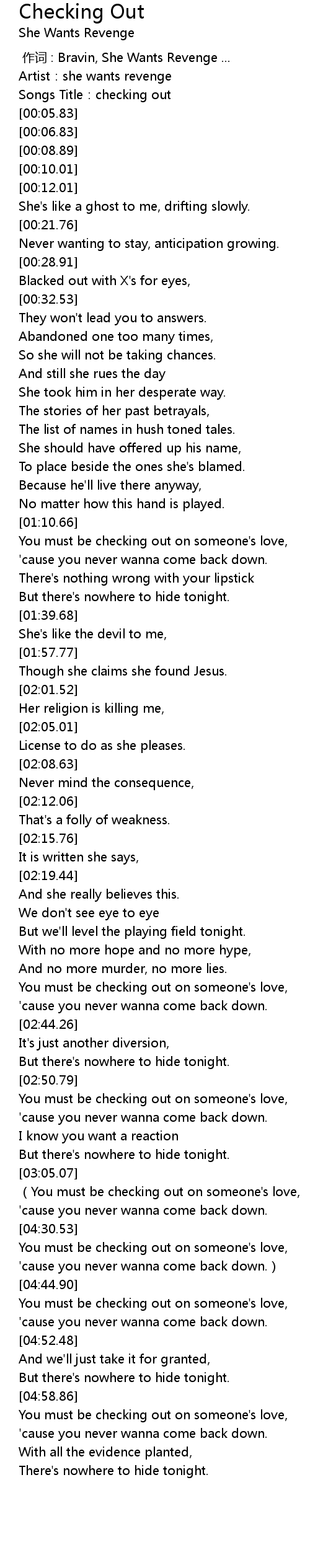 | [00:00.96] | Artist:she wants revenge |